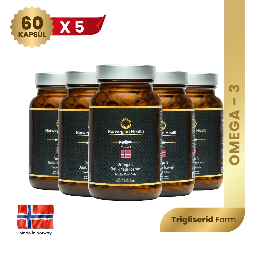 Norwegian Health olarak Türkiye’de gıda takviyeleri sektöründe hizmet vermekteyiz. Norveç’in yüzyıllardır süregelen bilgi ve tecrübesinden yararlanarak ürünlerimizi en yüksek kalitede üretmeyi amaçlıyoruz. Ürünümüz Trigliserid formdur. Kullanılan jelatin balık kaynaklıdır. Norveç Somonu ve Morina balığı kullanılarak üretilmiştir. 1 kapsül 1000 mg Balık yağı içerir ve bunun 860 mg’ı Omega 3 yağ asitlerinden oluşur. 1 kapsülde 300 mg DHA ve 250 mg EPA yer almaktadır. 11 yaş ve üzeri yetişkinler için tercihen günde 2 kez sabah ve akşam öğünlerle birlikte 1 kapsül kullanılması önerilir.